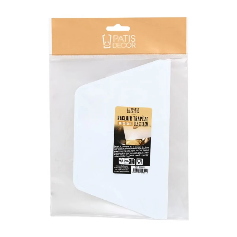 Le racloir trapèze Patisdécor est un ustensile de base en pâtisserie pour racler, lisser, manipuler ou couper avec précision. Sa forme trapézoïdale offre une excellente prise en main et permet d’atteindre les bords des récipients sans effort.