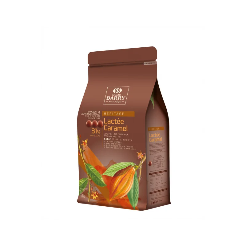 Chocolat de Couverture au Lait Lactée Caramel 5 kg 31,2 % Cacao Barry Le chocolat de couverture lait arôme caramel en pistoles est un chocolat au lait au goût prononcé de vrai caramel.
