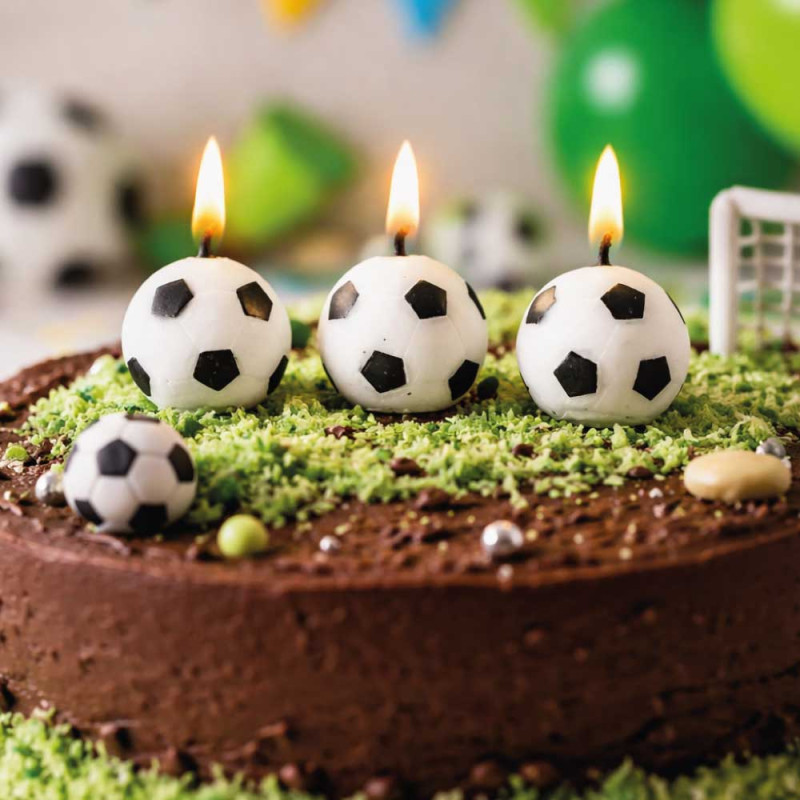 Bougies ballons de football, diamètre 2,5 cm, vendues en blister cartonné de 6 pièces.