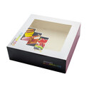 Boîtes pâtissières à fenêtres de forme carrée en carton, pour emballer et transporter plateaux de mignardises sucrées et salées et gâteaux de grande taille.