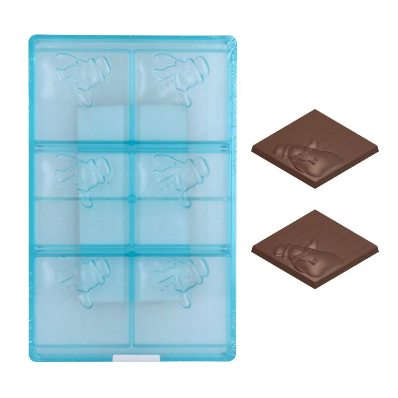 Moule tablettes de chocolat avec six empreintes carrées décorées de bonshommes de neige et de l'inscription "Joyeux Noël" en plusieurs langues.