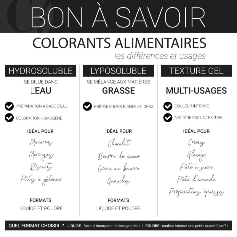 Neutre en goût, ce colorant permet de décorer les pâtisseries sans modifier leurs arômes ni leurs saveurs.
