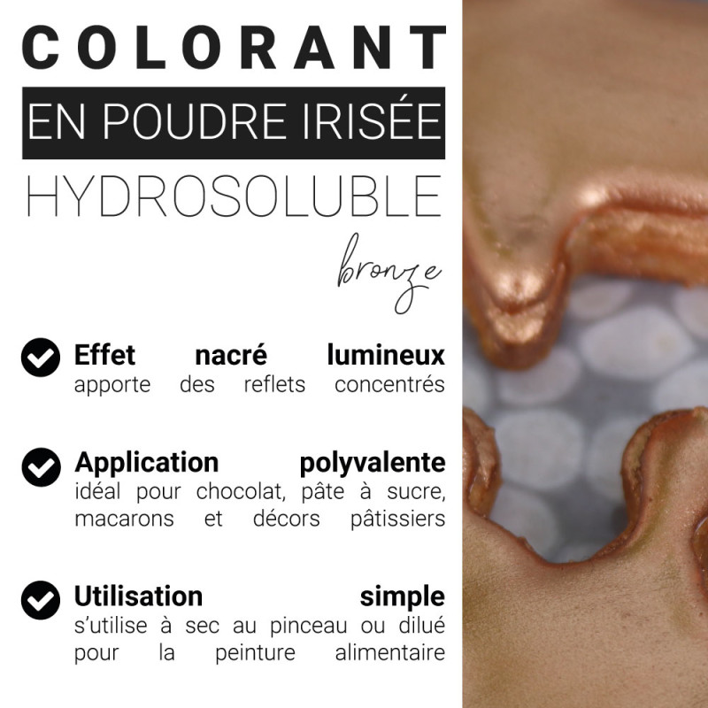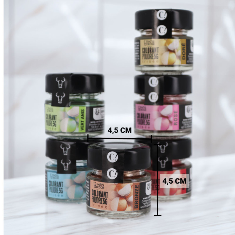 Apportez une touche élégante et lumineuse à vos desserts avec le colorant alimentaire irisé bronze Patisdécor. Sa poudre perlescente permet de sublimer facilement macarons, chocolats ou décors en pâte à sucre avec un effet raffiné. Facile à appliquer au pinceau ou à utiliser en peinture alimentaire, il offre une finition brillante et professionnelle.