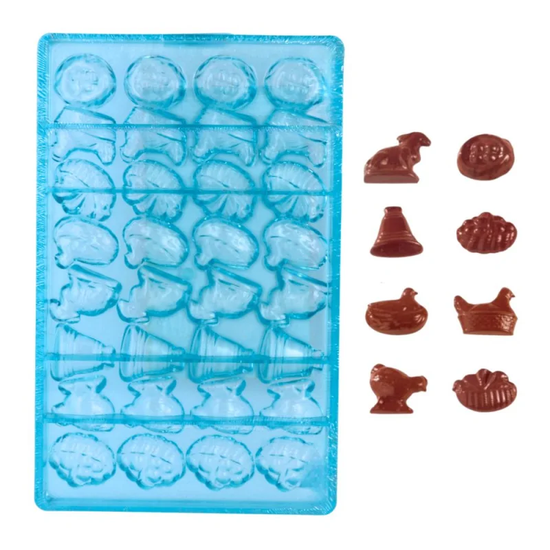 Moule à chocolat muni de 32 empreintes, permettant de réaliser des paniers, des poules, des cloches, des lapins, des poules couveuses et des nids.